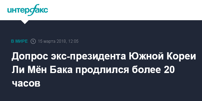 Москва. 15 марта. INTERFAX.RU - Прокуратура центрального района Сеула завершила допрос бывшего президента Южной Кореи Ли Мён Бака по делу о коррупции и злоупотреблении служебными полномочиями в годы, когда он занимал пост главы государства, сообщает в четверг агентство "Ренхап".