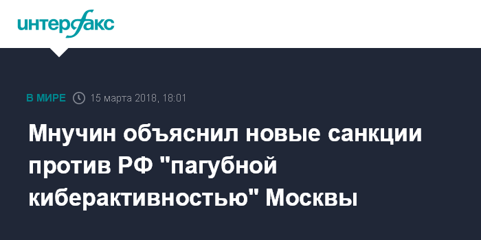 "Администрация (США) противостоит пагубной российской киберактивности, включая попытки вмешательства в выборы в США, разрушительные кибератаки, а также посягательства, целью которых является критическая инфраструктура", - приводятся в коммюнике слова главы Минфина Стивена Мнучина.