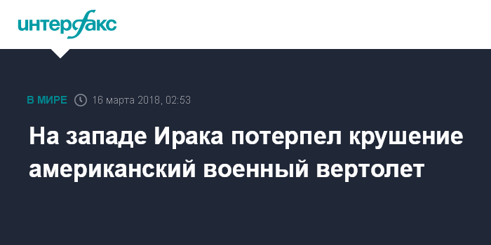 Москва. 16 марта. INTERFAX.RU - Американский военный вертолет потерпел крушение на западе Ирака недалеко от сирийской границы, сообщил телеканал CNN со ссылкой на возглавляемую США коалицию.