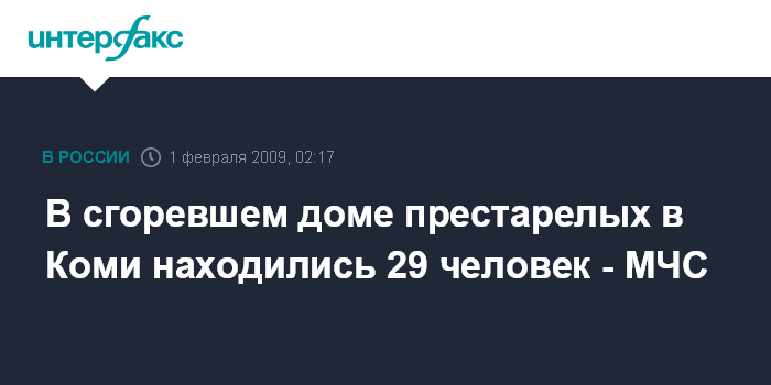 Москва. 1 февраля. ИНТЕРФАКС - В доме престарелых в Коми, где произошел пожар, находились 29 человек, сообщили в воскресенье в Управлении информации МЧС России.