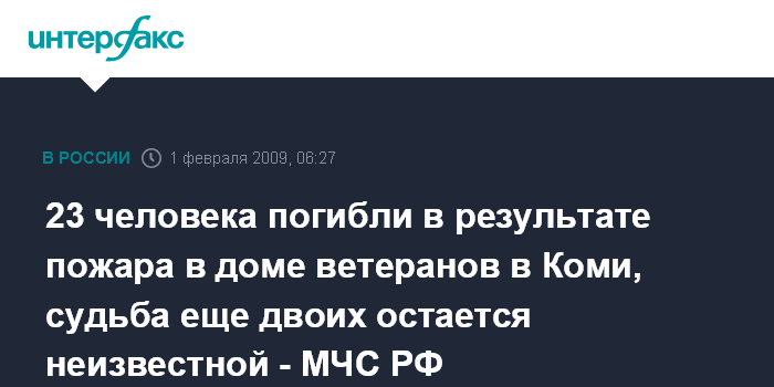 Москва. 1 февраля. ИНТЕРФАКС - 23 человека погибли в результате пожара в доме престарелых в Коми, судьба еще двоих остается неизвестной, сообщили "Интерфаксу" в МЧС России в воскресенье утром.