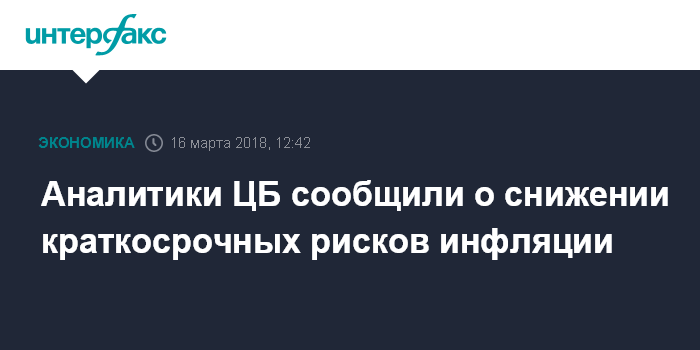 Москва. 16 марта. INTERFAX.RU - Краткосрочные проинфляционные риски уменьшились в феврале, однако среднесрочные риски инфляции все еще сохраняются, говорится в обзоре департамента исследований и прогнозирования ЦБ РФ "О чем говорят тренды".