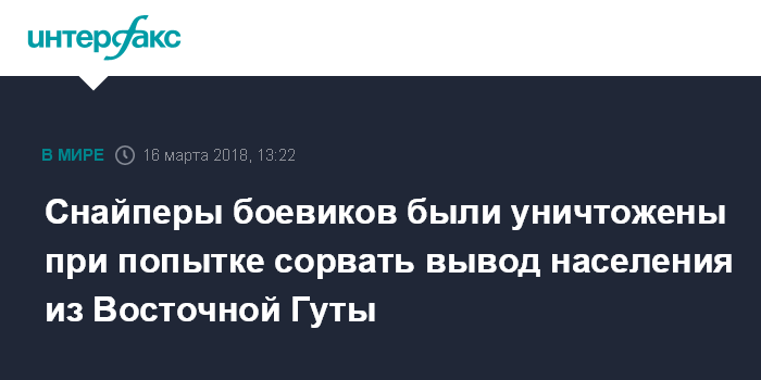 Москва. 16 марта. INTERFAX.RU - Уничтожены снайперы боевиков, которые пытались помешать выходу населения из Восточной Гуты, сообщили российские военные.