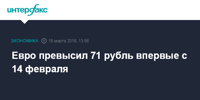 Москва. 16 марта. INTERFAX.RU - Евро в ходе торгов на Московской бирже в пятницу днем превысил 71 рублей впервые с 14 февраля, доллар приблизился к 58 рублям.