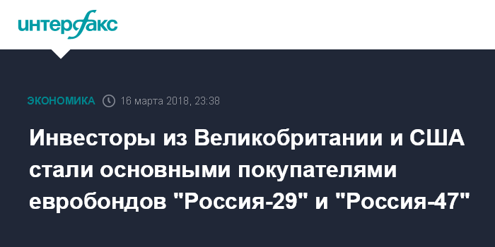 Москва. 16 марта. INTERFAX.RU - Сложный политический фон не помешал инвесторам из Великобритании и США предъявить высокий спрос на российский суверенный долг. Британские и американские инвесторы стали основными покупателями новых евробондов "Россия-2029" и дополнительного выпуска евробондов "Россия-2047", свидетельствуют данные единственного организатора сделки - "ВТБ Капитала".