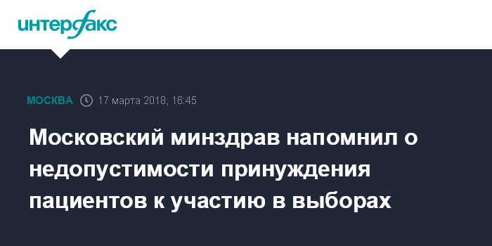 Москва. 17 марта. INTERFAX.RU - Главы учреждений здравоохранения Москвы проинформированы о недопустимости принуждения голосования на выборах президента России, заявили "Интерфаксу" в пресс-службе городского департамента здравоохранения в субботу.