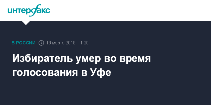 Москва. 18 марта. INTERFAX.RU - Пожилой избиратель умер в воскресенье в Уфе во время голосования на выборах президента России, сообщили "Интерфаксу" в Минздраве Башкирии.