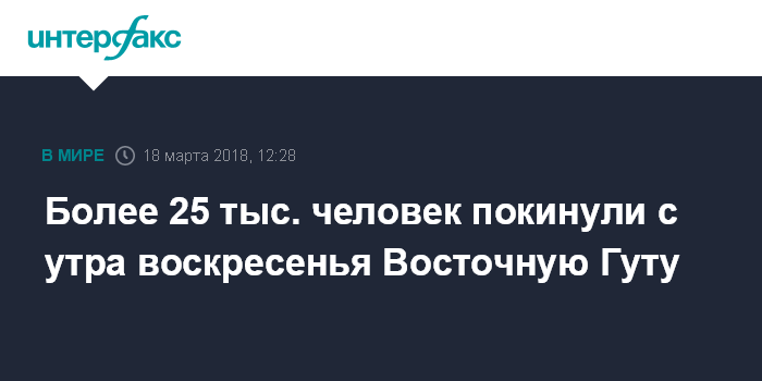 Москва. 18 марта. INTERFAX.RU - Восточную Гуту с утра воскресенья покинули более 25 тыс. человек, выход мирных жителей продолжается, сообщил представитель центра по примирению враждующих сторон генерал-майор Владимир Золотухин.