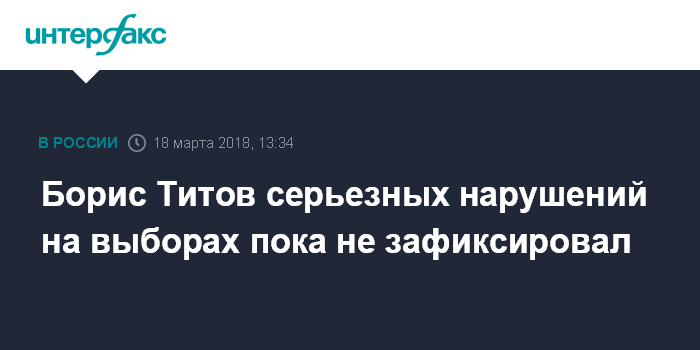 Москва. 18 марта. INTERFAX.RU - Штаб кандидата в президенты России Бориса Титова на данный момент не отмечает серьезных нарушений на выборах.