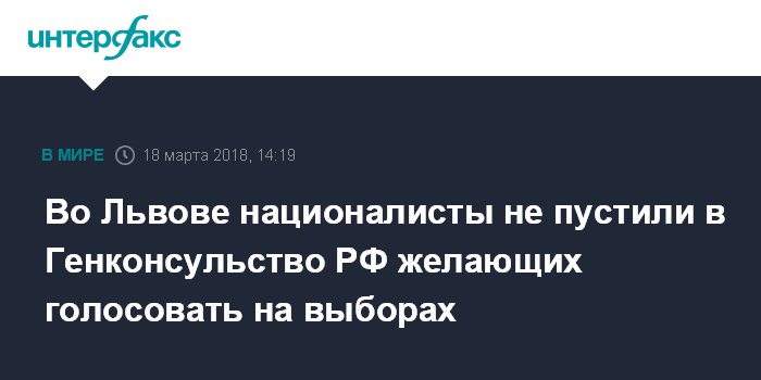 В этот же день украинская полиция не пустила к зданию посольства России на Украине (Киев) желающих проголосовать на выборах российского президента. Правоохранители разрешили пройти в дипучреждение только его сотрудникам. У ограждения на подходе к посольству националисты также устроили акцию.