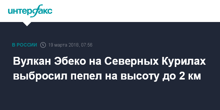 Москва. 19 марта. INTERFAX.RU - Расположенный на острове Парамушир (Северные Курилы, Сахалинская область) вулкан Эбеко в понедельник днем выбросил столб пепла на высоту до 2 км над уровнем моря, сообщает Камчатская группа реагирования на вулканические извержения (KVERT) Института вулканологии и сейсмологии Дальневосточного отделения РАН.
