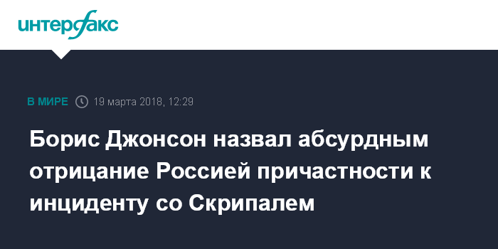 Москва. 19 марта. INTERFAX.RU - Отрицание Россией причастности к отравлению экс-сотрудника ГРУ Сергея Скрипаля в британском Солсбери становится все более абсурдным, считает министр иностранных дел Великобритании Борис Джонсон.