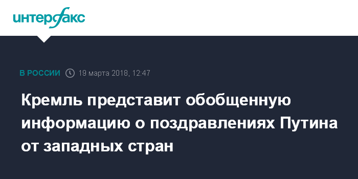 "Мы обобщаем сейчас. От западных стран есть поздравления, мы дадим вам информацию обобщенную", - сказал Песков журналистам на вопрос, поступили ли Путину поздравления от лидеров США и Западной Европы. При этом он не стал конкретизировать, от кого эти поздравления.