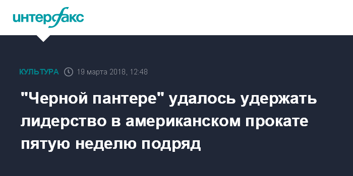 Москва. 19 марта. INTERFAX.RU - "Черная пантера", фильм по комиксам Marvel, занял первую строчку в североамериканском прокате по итогам пятой недели подряд, собрав $27 млн, свидетельствуют данные Box Office Mojo.