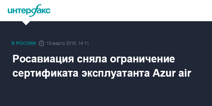 "Решение о снятии ограничений принято на основе комплексного анализа отчета авиакомпании об устранении недостатков, выявленных при проведении плановой проверки в январе 2018 года, заявки и документации ООО "АЗУР эйр" (юридическое название Azur air - ИФ) на снятие ограничений срока действия сертификата эксплуатанта, а также результатов инспекционной проверки авиакомпании в период с 14 по 15 марта 2018 года. ООО "АЗУР эйр" подтвердило устранение выявленных ранее замечаний и несоответствий требованиям воздушного законодательства", - говорится в сообщении регулятора.