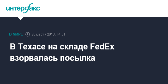 Москва. 20 марта. INTERFAX.RU - Посылка, предназначенная для отправки в американский город Остин (штат Техас) взорвалась на складе почтовой компании FedEx в городе Шерц (Техас), сообщает во вторник американский телеканал CBS со ссылкой на ФБР.