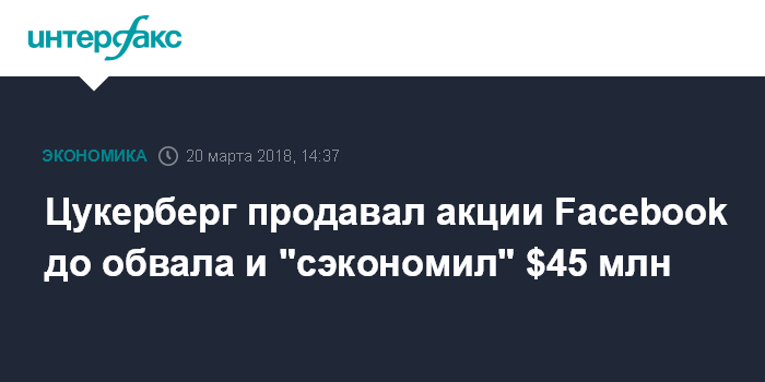 С начала 2018 года Цукерберг продал около 4,9 млн акций Facebook. С учетом средневзвешенной цены в документах, представленных в Комиссию по ценным бумагам и биржам (SEC) США, он заработал на этих операциях около $900 млн. После падения 19 марта стоимость этих бумаг составила бы $855 млн.