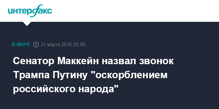 Москва. 21 марта. INTERFAX.RU - Сенатор-республиканец Джон Маккейн раскритиковал президента США Дональда Трампа за то, что он позвонил Владимиру Путину и поздравил его с победой на выборах, сообщает The Hill.