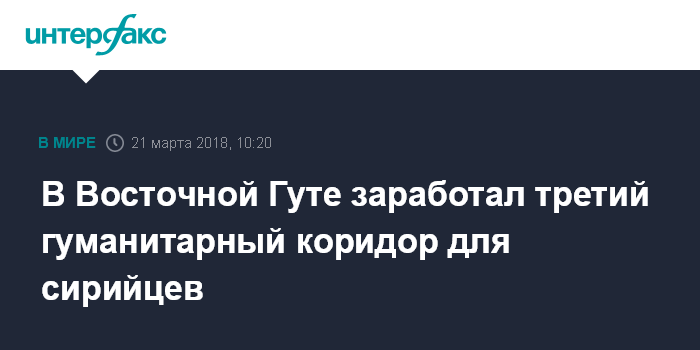 Москва. 21 марта. INTERFAX.RU - Третий гуманитарный коридор начал действовать в районе сирийской Восточной Гуты, говорится в распространенном телеканалом "Россия 24" (ВГТРК) сообщении российского Центрп по примирению враждующих сторон в Сирийской арабской республике.