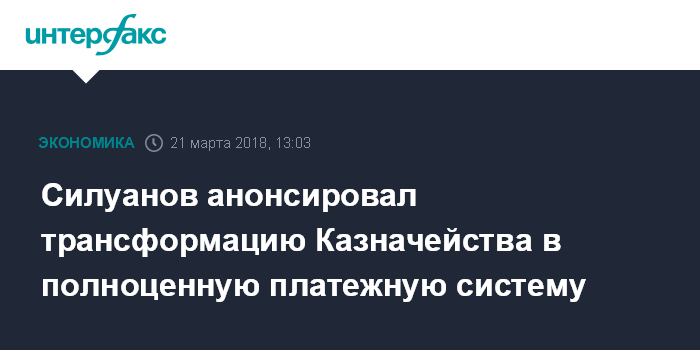 Москва. 21 марта. INTERFAX.RU - Федеральному Казначейству в ближайшие годы предстоит трансформация в платежную систему, заявил министр финансов Антон Силуанов, выступая на коллегии ведомства в Москве.