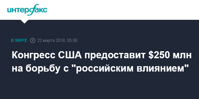 Москва. 22 марта. INTERFAX.RU - Конгресс США собирается выделить $250 млн на борьбу с российским влиянием, говорится в тексте проекта бюджета США на 2018 финансовый год.