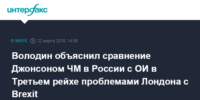 "Британские политики опустились до хамства, это говорит о том, что все настолько у них плохо. Более того, конфликт с Евросоюзом, связанный с выходом Великобритании (из ЕС - ИФ) заставляет их формировать повестку других конфликтов с тем, чтобы от себя эту ситуацию отодвинуть", - сказал журналистам в четверг Володин.
