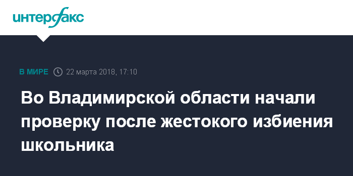 Москва. 22 марта. INTERFAX.RU - Следователи в Покрове (Владимирская область) начали проверку по факту избиения 13-летнего школьника подростками, сообщает следственное управление СКР по региону.