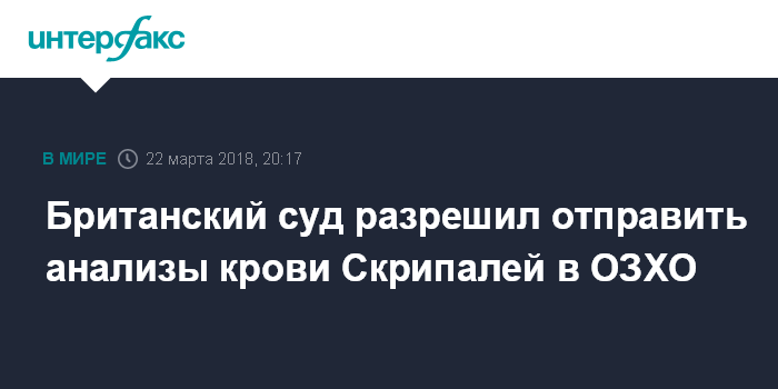 Москва. 22 марта. INTERFAX.RU - Британский суд постановил, что врачи могут предоставить Организации по запрещению химического оружия (ОЗХО) анализы крови бывшего офицера ГРУ Сергея Скрипаля и его дочери, которые были отравлены неизвестным веществом в начале марта в Солсбери, сообщает Associated Press.