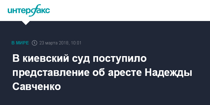Москва. 23 марта. INTERFAX.RU - В Шевченковский райсуд Киева поступило представление об избрании меры пресечения народному депутату Надежде Савченко в виде ареста. На рассмотрение направлено ходатайство о применении меры пресечения в виде содержания под стражей.
