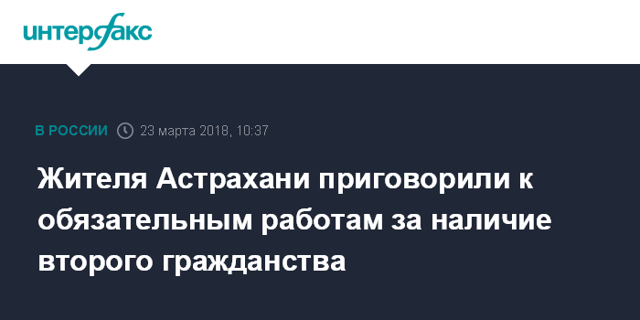 Москва. 23 марта. INTERFAX.RU - Ленинский районный суд Астрахани признал местного жителя виновным в неуведомлении о наличии гражданства другого государства, сообщает пресс-служба следственного управления СК РФ по региону.