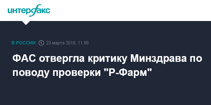 Москва. 23 марта. INTERFAX.RU - Федеральная антимонопольная служба (ФАС) подчеркнула, что убеждена в отсутствии нарушений в ходе проверки, в результате которой регулятор выявил признаки сговора Минздрава с "Р-Фарм" на рынке госзакупок.