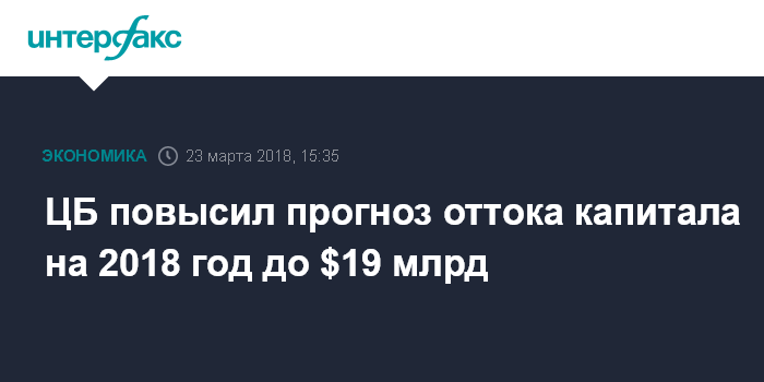 Москва. 23 марта. INTERFAX.RU - ЦБ РФ повысил прогноз оттока капитала из РФ до $19 млрд с прежней оценки $16 млрд, заявила председатель ЦБ РФ Эльвира Набиуллина на пресс-конференции в пятницу.