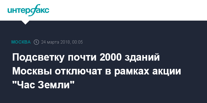Москва. 24 марта. INTERFAX.RU - Москва в субботу в десятый раз примет участие в международной экологической акции "Час Земли", в рамках которой в городах по всему миру отключается подсветка знаковых объектов, а жителям рекомендуется на час отказаться от пользования электроприборами и выключить свет.