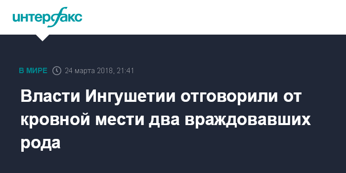 Москва. 24 марта. INTERFAX.RU - Благодаря усилиям духовенства и республиканских властей в Малгобекском районе Ингушетии примирились два тейпа (рода) "кровников", конфликтовавших на протяжении более восьми лет, сообщил агентству "Интерфакс" сотрудник пресс-службы главы региона в субботу.