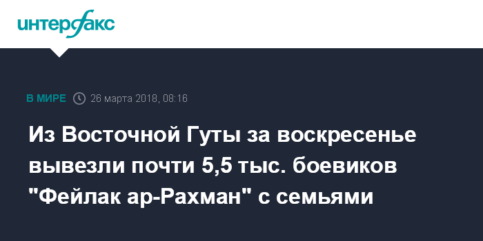 Москва. 26 марта. INTERFAX.RU - Почти 5,5 тысяч боевиков группировки "Фейлак ар-Рахман" выведены из Восточной Гуты в Сирии за воскресенье, сообщили в понедельник в Минобороны РФ