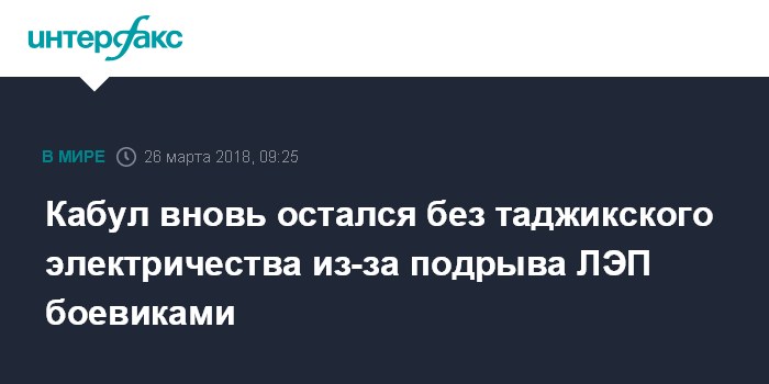 Москва. 26 марта. INTERFAX.RU - Подача электроэнергии из Таджикистана в Кабул в очередной раз прервана из-за подрыва опоры ЛЭП на территории северной афганской провинции Баглан, сообщил в понедельник утром телеканал Ariana News со ссылкой на местные власти.