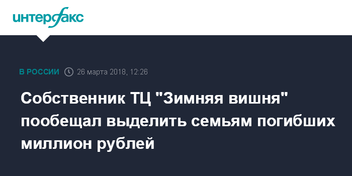 Москва. 26 марта. INTERFAX.RU - Собственник торгово-развлекательного комплекса "Зимняя вишня", где в результате пожара по последним данным, погибли 64 человека, выплатит 1 млн рублей семьям погибших.
