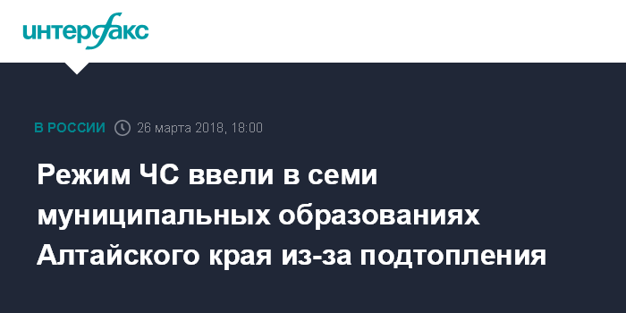 "Режим чрезвычайной ситуации в связи с ухудшением паводковой обстановки на территории региона объявлен в Белокурихе, Чарышском, Петропавловском, Солонешенском, Третьяковском, Алтайском районах. С 24 марта режим ЧС действует на территории Краснощековского района. По оперативным данным, в населенных пунктах региона талыми водами подтоплено 2 тысячи 109 приусадебных участков, 970 жилых домов", - говорится в сообщении.