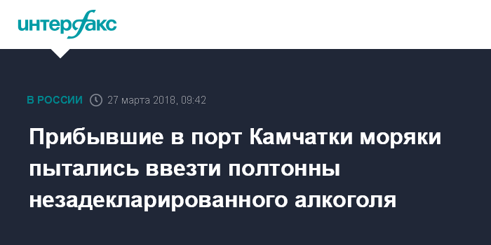 Москва. 27 марта. INTERFAX.RU - Инспекторы Камчатской таможни изъяли 474 литра незадекларированных алкогольных напитков во время досмотра российского судна, прибывшего из Пусана (Республика Корея) в порт Петропавловска-Камчатского, сообщает во вторник пресс-служба ведомства.