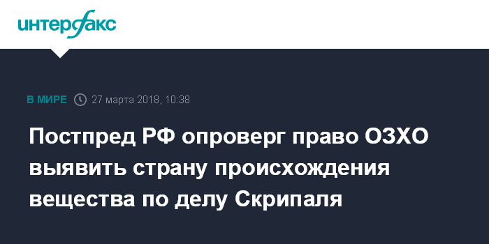 Москва. 27 марта. INTERFAX.RU - У Организации по запрещению химического оружия (ОЗХО) нет мандата определять в ходе экспертизы страну происхождения нервнопаралитического агента, которым, предположительно, были отравлены Сергей Скрипаль и его дочь Юлия, заявил постпред РФ при ОЗХО Александр Шульгин.