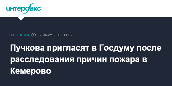 Москва. 27 марта. INTERFAX.RU - Глава МЧС РФ Владимир Пучков будет приглашен в Государственную Думу по итогам расследования ведомством причин пожара в торгово-развлекательном комплексе "Зимняя вишня" в Кемерове.