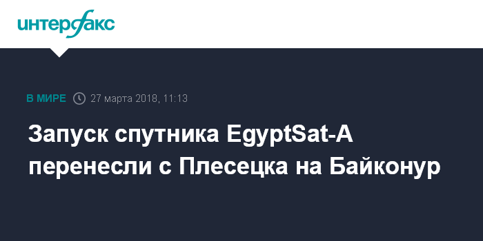 "Запуск египетского спутника ДЗЗ EgyptSat-А, создаваемый РКК Энергия и планировавшийся с космодрома Плесецк в октябре 2018 года из-за организационных проблем перенесен на другой космодром - Байконур. Спутник будет запущен в ноябре", - сказал источник.