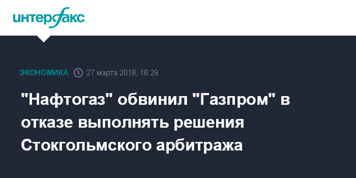 "Газпром" дал понять, что российская газовая монополия отказывается возобновлять поставки на Украину, как это предусмотрено решением Стокгольмского арбитража от декабря прошлого года, и отказывается подтвердить выплату $2,6 млрд согласно решению арбитража по транзитному контракту от февраля текущего года", - заявили в "Нафтогазе".