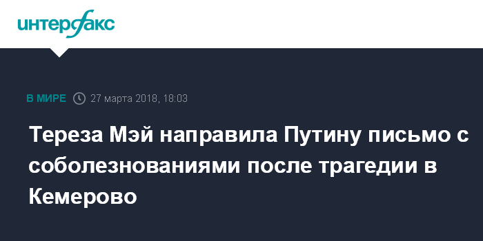 Тереза Мэй направила Путину письмо с соболезнованиями после трагедии в Кемерово