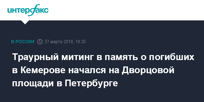 Москва. 27 марта. INTERFAX.RU - Жители Санкт-Петербурга собрались на Дворцовой площади, чтобы почтить память погибших при пожаре в торговом центре "Зимняя вишня" в городе Кемерово, передал корреспондент "Интерфакса".
