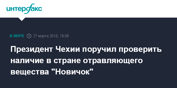 Москва. 27 марта. INTERFAX.RU - Президент Чехии Милош Земан поручил Службе безопасности и информации (контрразведке) выяснить "возможность наличия или складирования на чешской территории отравляющего вещества типа "Новичок"", которым, по утверждениям британской стороны, был отравлен бывший сотрудник ГРУ Сергей Скрипаль.