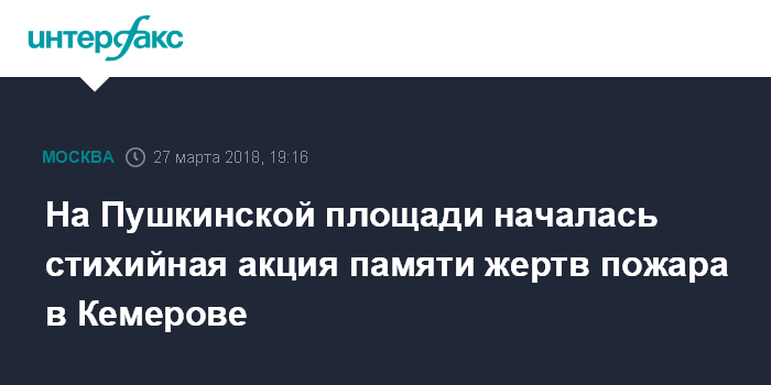 Москва. 27 марта. INTERFAX.RU - Стихийная акция в память о жертвах пожара в торгово-развлекательном центре "Зимняя вишня" Кемерова проходит на Пушкинской площади в Москве.