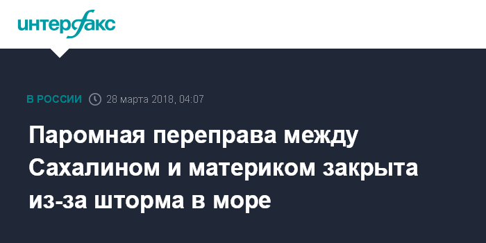 "28 марта в 03:45 по сахалинскому времени (27 марта 19:45 мск) с прибытием грузового парома "Сахалин-10" в порт Ванино Хабаровского края переправа закрылась из-за ухудшения погоды. В Татарском проливе сейчас ветер до 22 м\с и шторм с высотой волн до 4,5 м. Улучшение погоды прогнозируется к вечеру среды", - рассказал собеседник агентства.