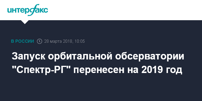 Москва. 28 марта. INTERFAX.RU - Запуск рентгеновской орбитальной обсерватории "Спектр-РГ", а также космического аппарата "Электро-Л" №3, которому до конца года предстоит проходить тепловакуумные испытания, и двух коммерческих запусков ракеты-носителя "Протон" в интересах ILS, скорее всего, будет перенесен на 2019 год. Об этом сообщил "Интерфаксу" источник на "Байконуре".