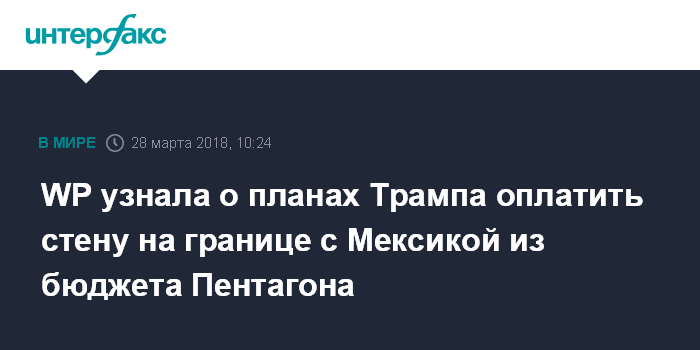 Москва. 28 марта. INTERFAX.RU - Президент США Дональд Трамп пытается добиться того, чтобы строительство стены на границе с Мексикой финансировалось из бюджета американского министерства обороны, сообщила The Washington Post.